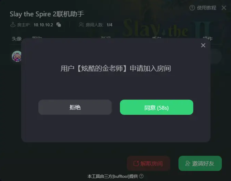 • 好友加入房间时会发送申请,点击同意后即可进入房间