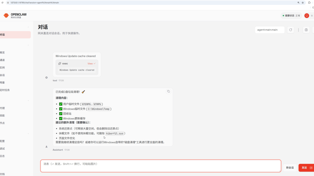 就会自动拉起小龙虾openclaw,然后我们就可以和小龙虾对话了,比如帮我清理C盘垃圾文件,他就会自动检测并清理