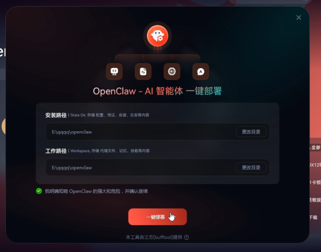 选择好安装路径并同意条款点击红色的一键部署