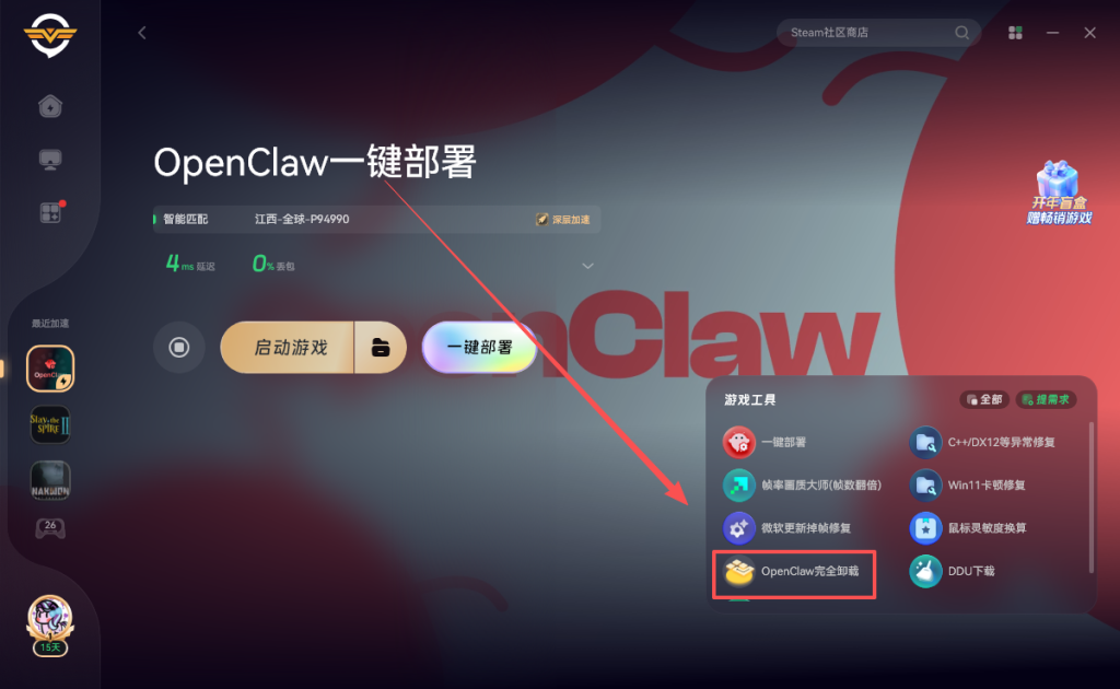 由于小龙虾是本地部署的卸载起来比较麻烦,奇游同样支持一键卸载,点击右侧的openclaw完全卸载