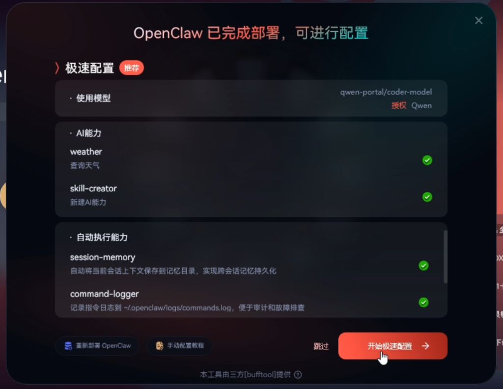部署完成我们点击右下角的开始急速配置