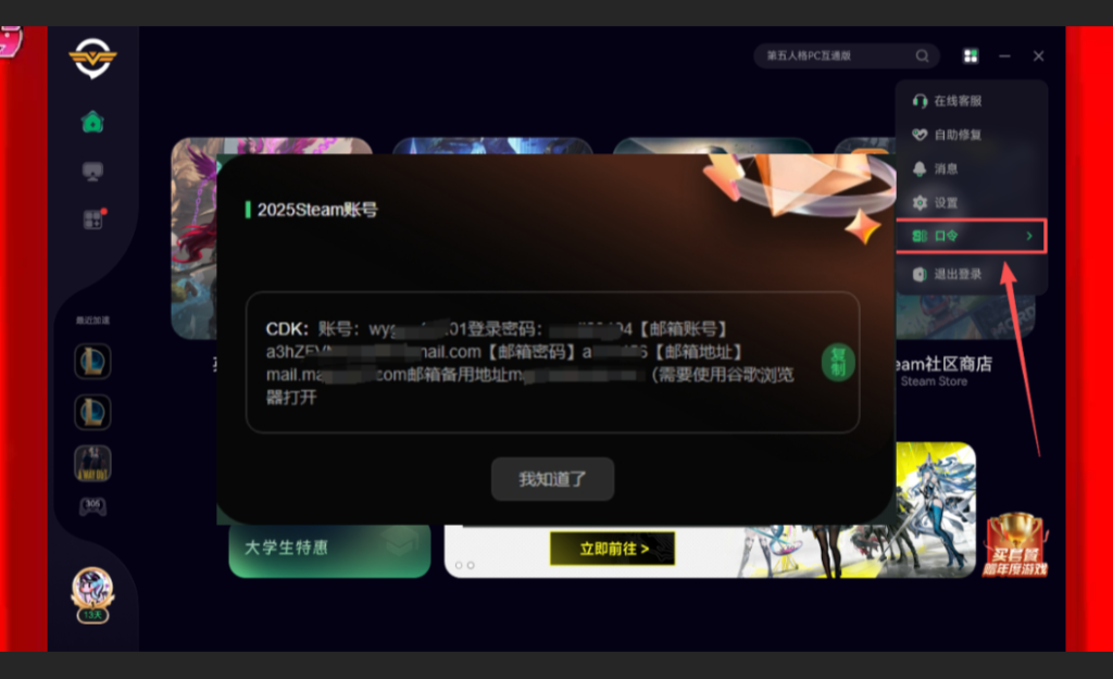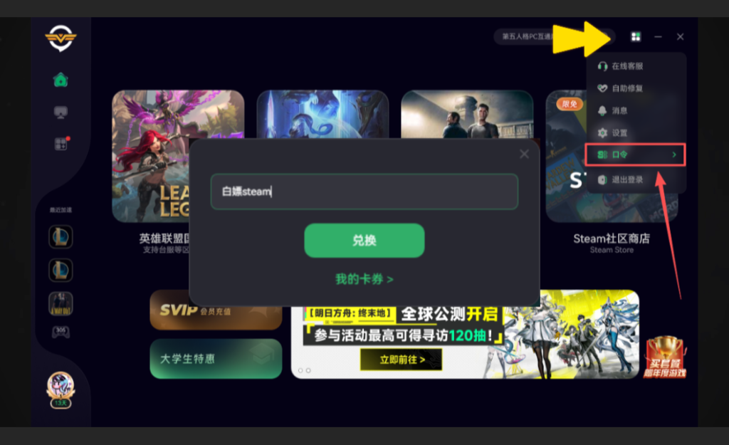 只需打开奇游点击右上角工具栏口令输入【白嫖steam】