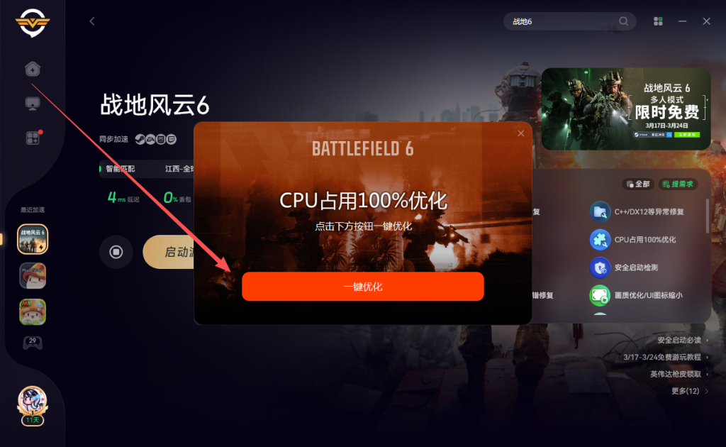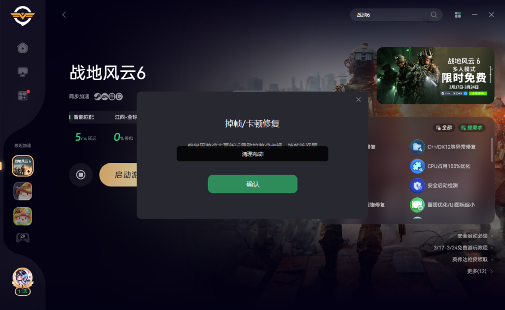 打开奇游加速《战地6》点击右侧的掉帧卡顿修复