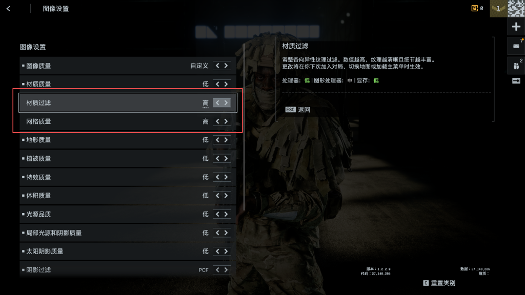 建议材质过滤和网格质量可以根据配置调高,其他的全低或者关闭