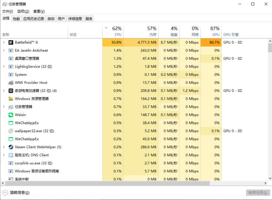 可以看到GPU的占用率也没有下降哦。CPU的占用率降低后可以有效改善游戏卡顿问题。