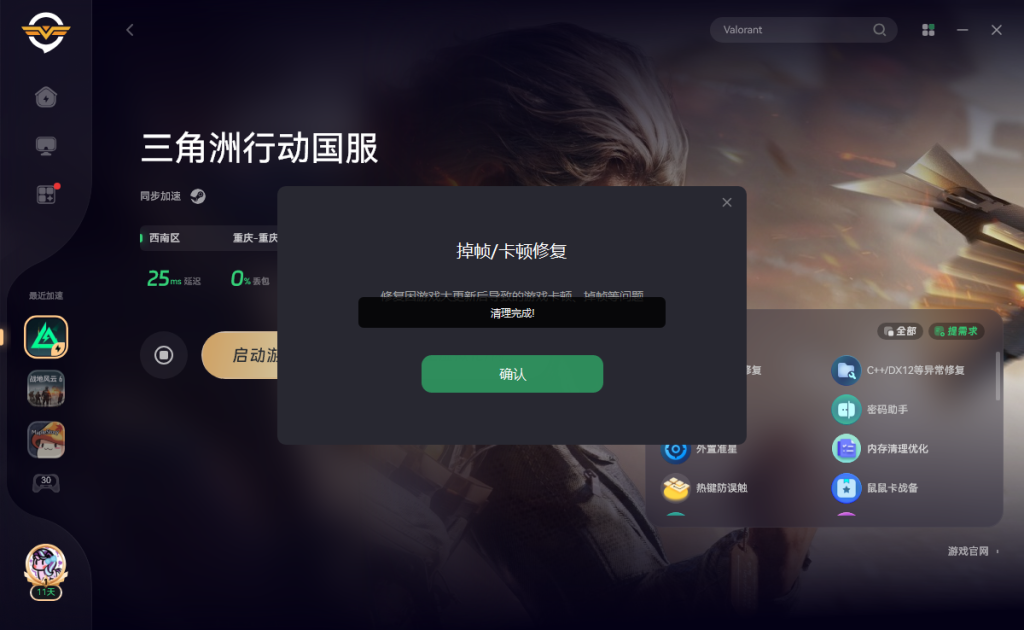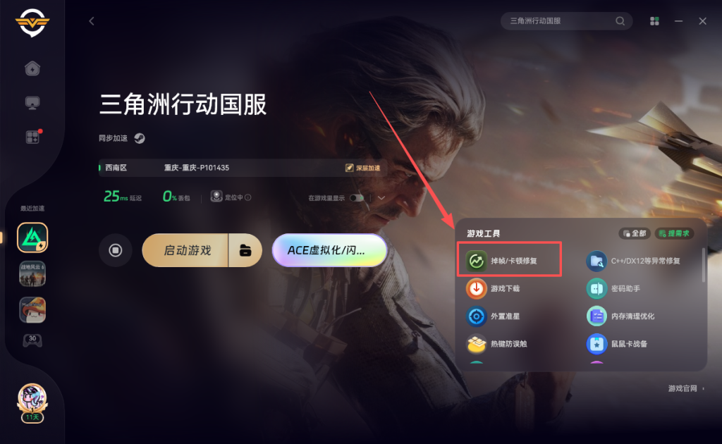 打开奇游加速《三角洲行动》点击右侧的掉帧卡顿修复