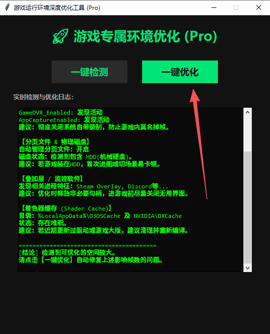 就会一键检测系统电源模式磁盘状态,着色器缓存等问题
