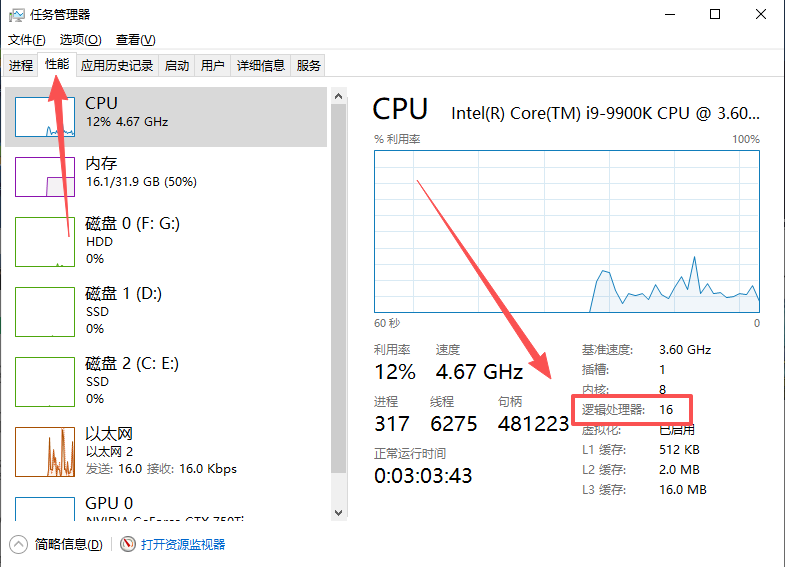 第四条,我们打开任务管理器性能中查看CPU的逻辑处理器