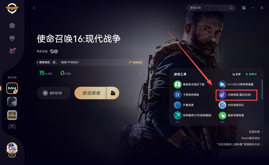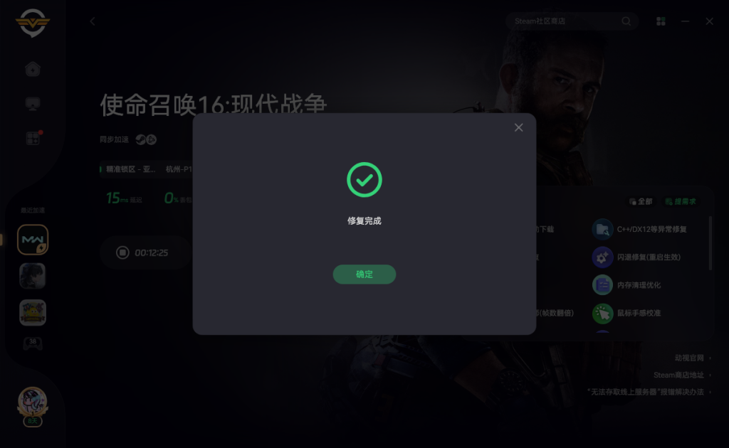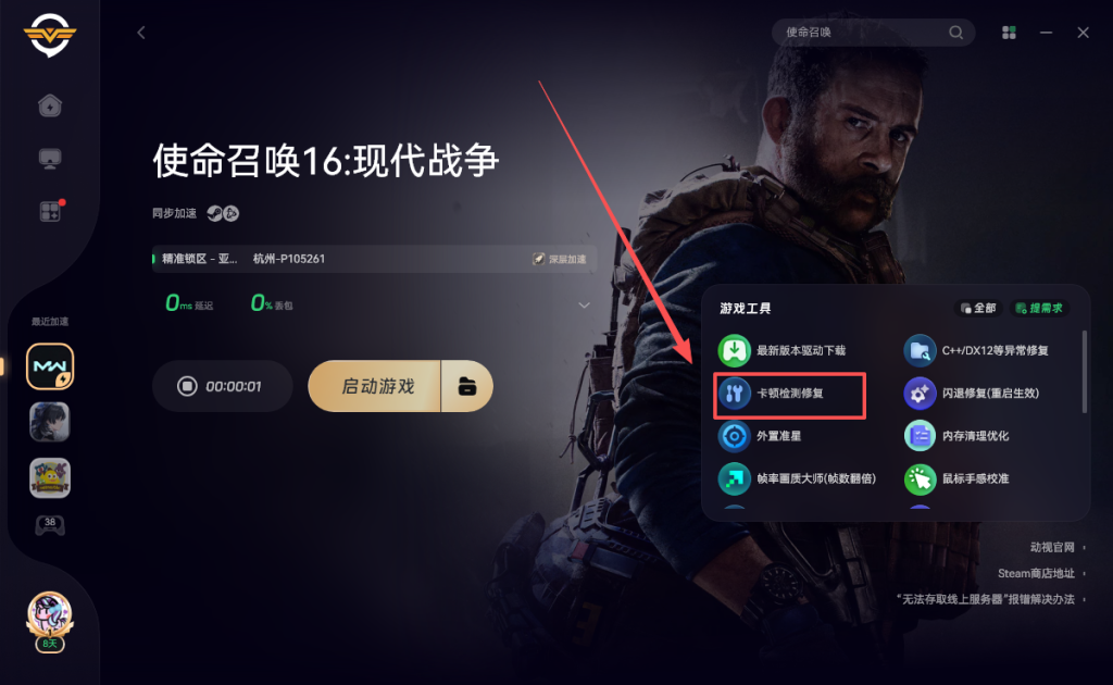 打开奇游加速《使命召唤16》点击右侧的卡顿检测修复