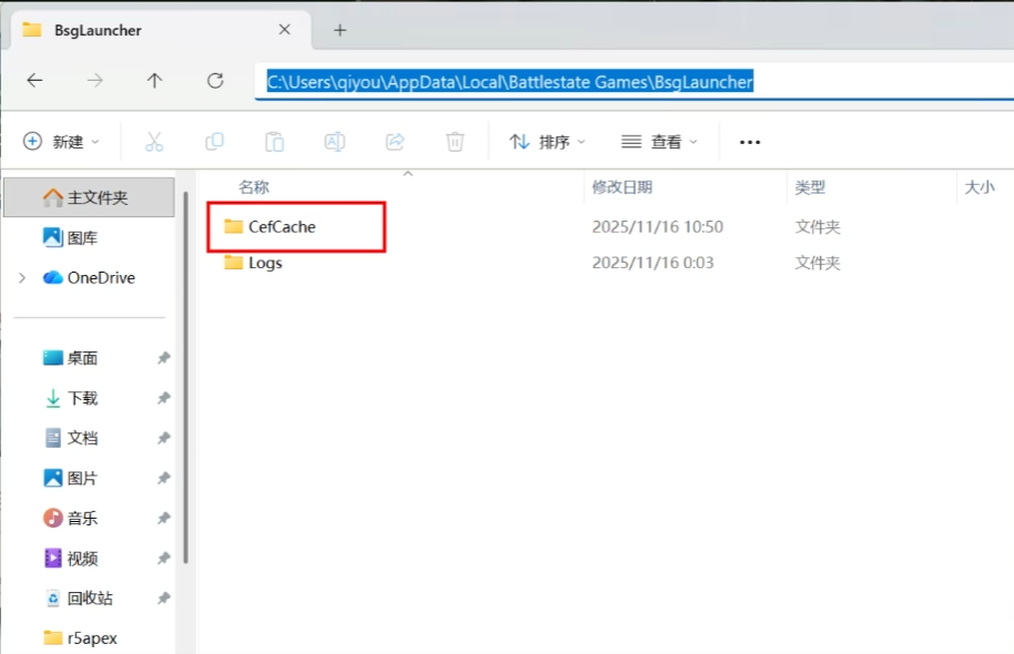 我们在C盘这个路径删除CefCache缓存文件夹文件夹即可正常进入游戏。