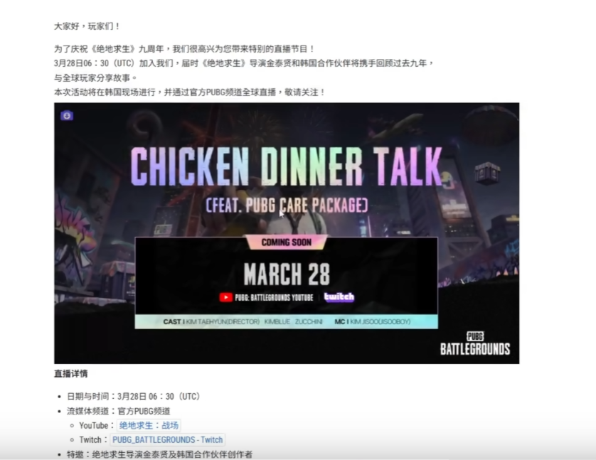 pubg全知视角直播今天下午2.30开始直播内容包含今年的改动方向