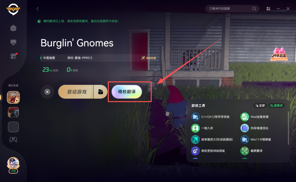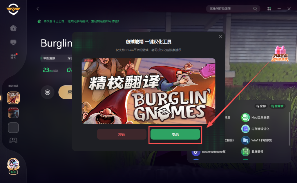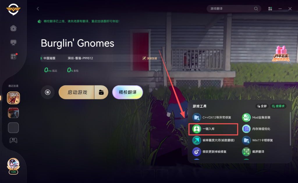 之后打开奇游加速《Burglin’ Gnomes》点击右侧的一键入库