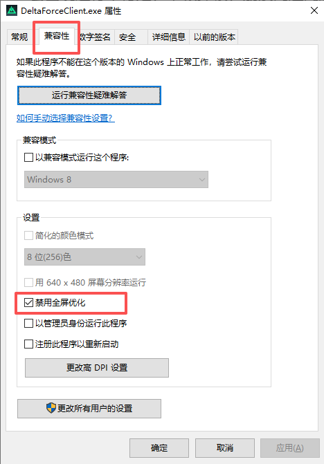 在兼容性中勾选禁用全屏优化并保存可以有效提高GPU占用率