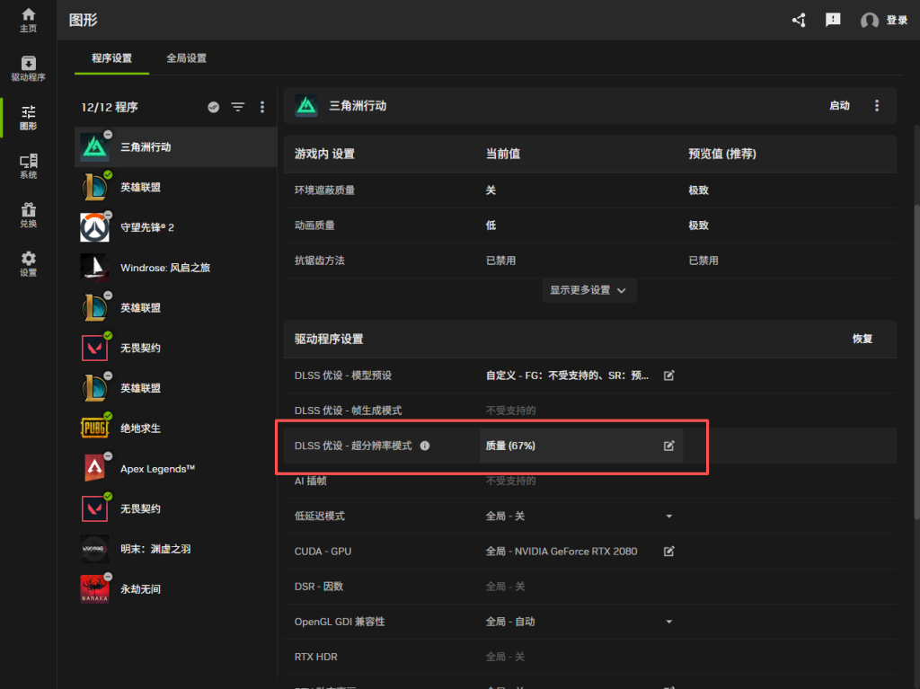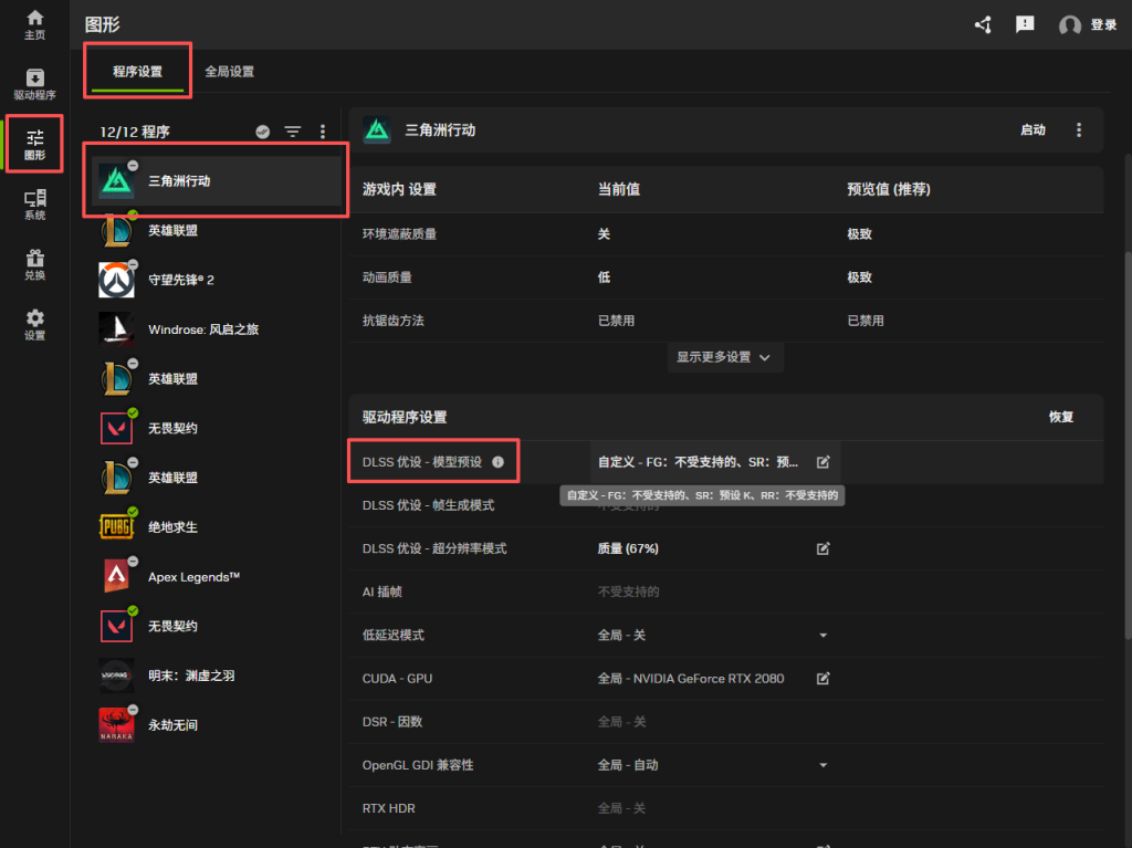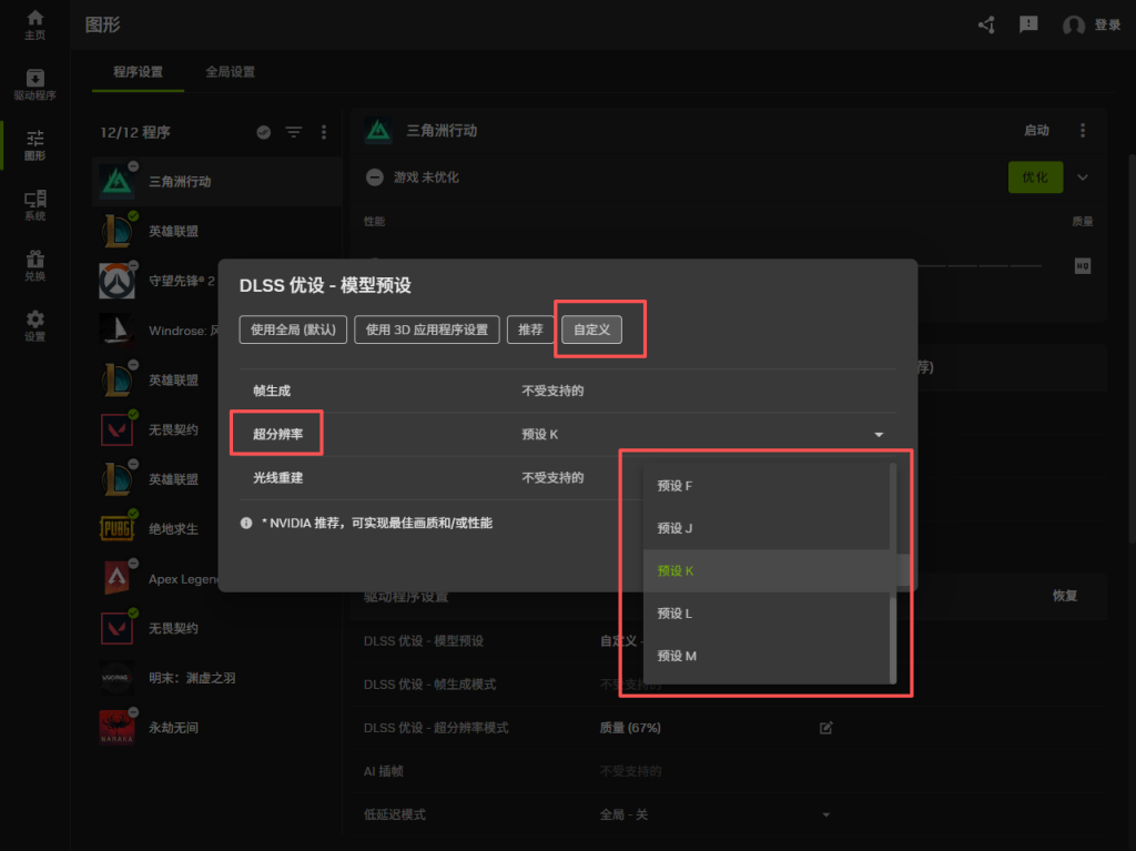 在图形程序设置选择三角洲找到DLSS模型预设