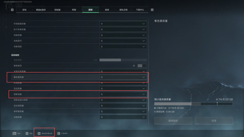 需要把【着色器质量】和【阴影质量】设置为低