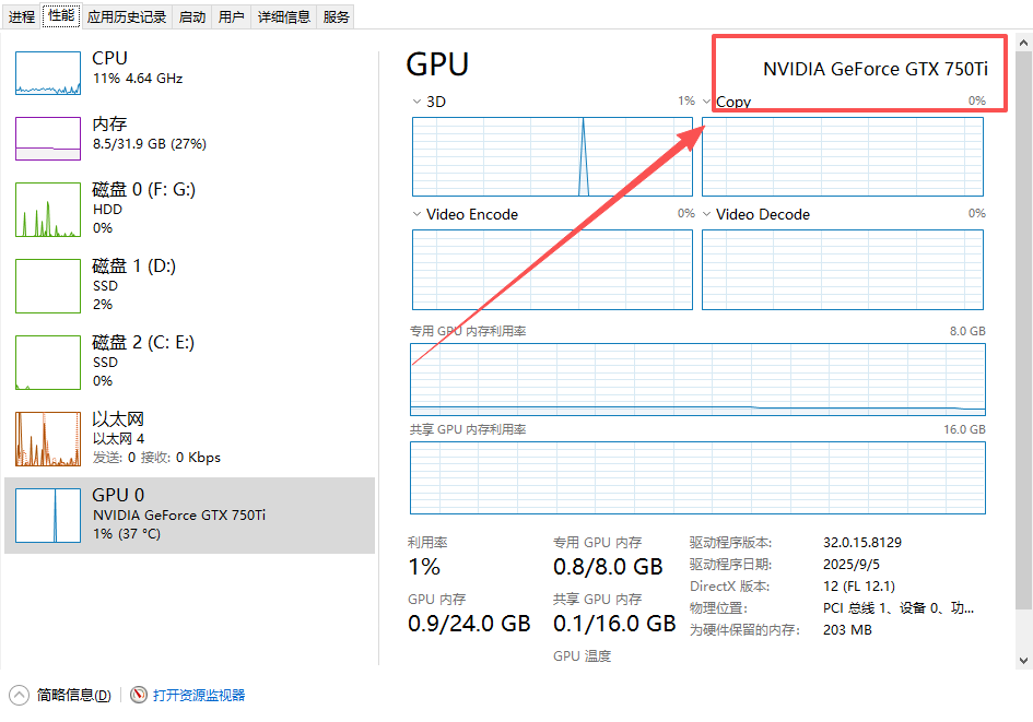 我们进入游戏也能看到是750 Ti