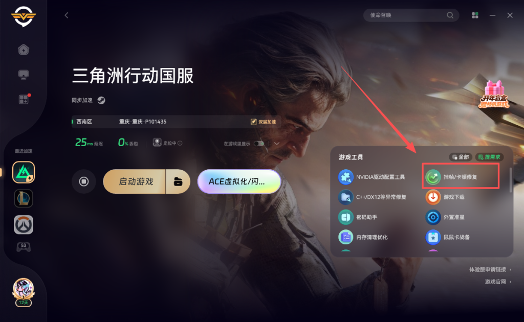 打开奇游加速《三角洲行动》点击右侧的掉帧卡顿修复