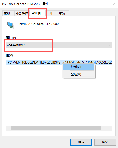 详细信息中选择设备实例路径并复制