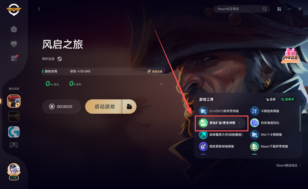 奇游支持一键安装,打开奇游加速《风启之旅》点击右侧的背包扩展/更多掉落
