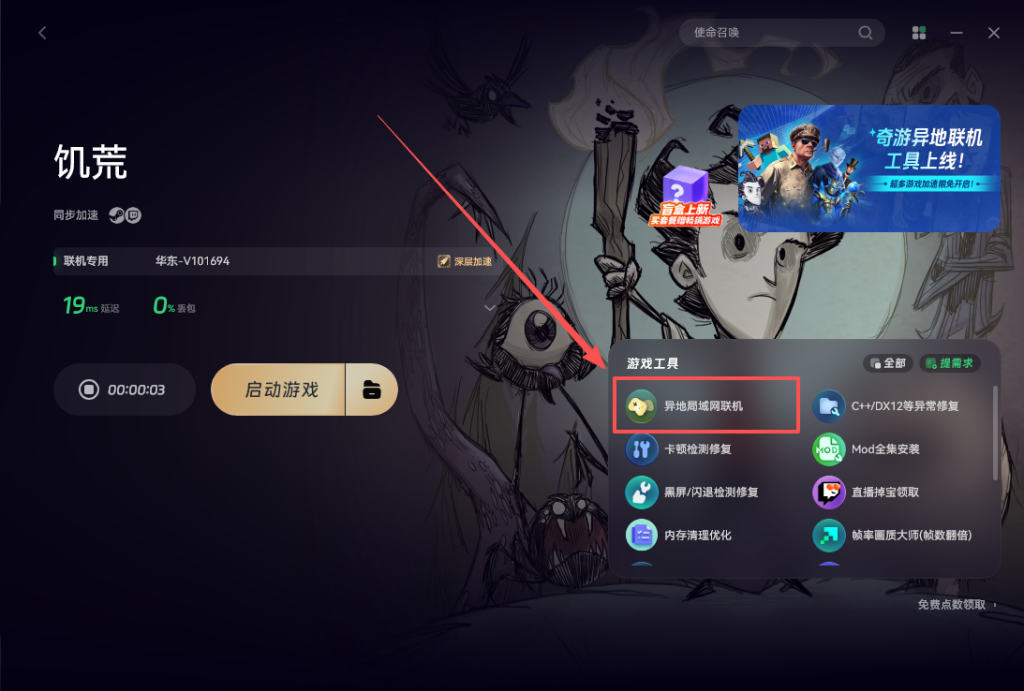 奇游加速《饥荒》点击右侧的异地局域网联机工具