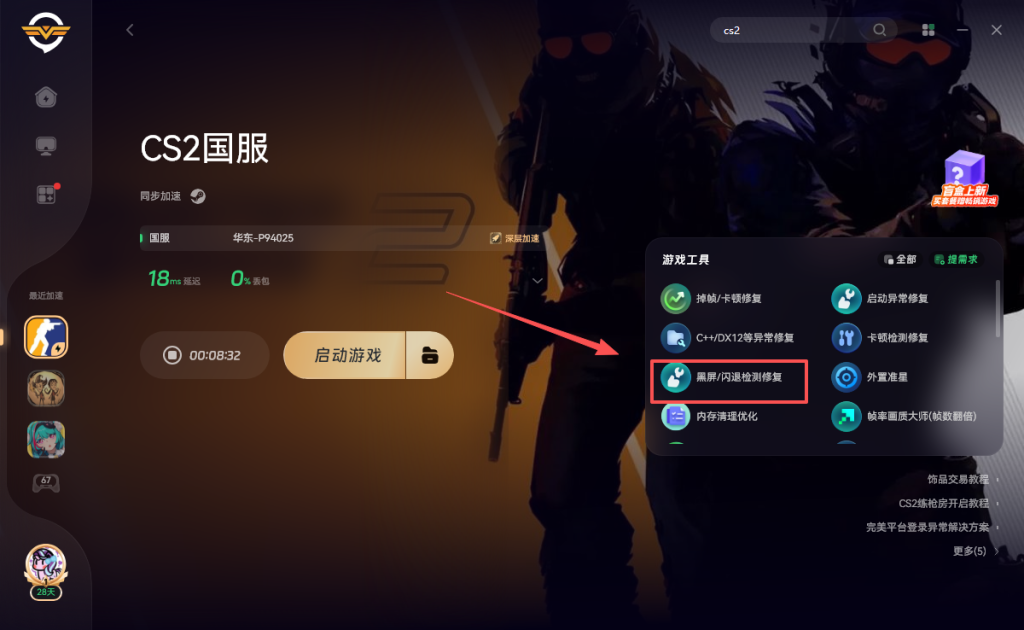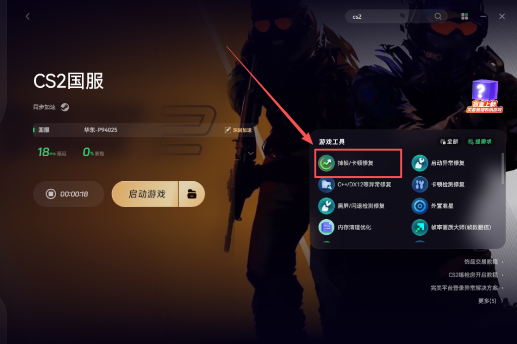 打开奇游加速CS2点击右侧的掉帧卡顿修复