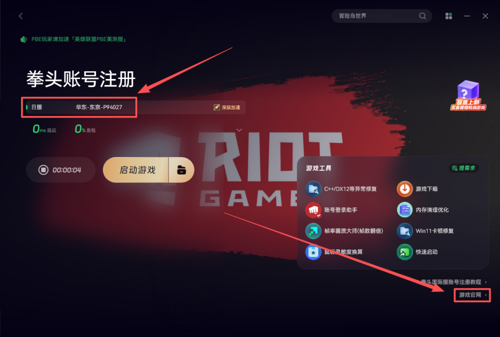 打开奇游加速《拳头账号注册》日服点击右侧的游戏官网