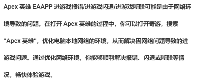 Apex这款游戏相信大家都听说过它玩法和吃鸡比较类似,通过和其他的游戏玩家组成的三人小队,然后在地图里获取武器资源,淘汰掉其他玩家最终获得最终的胜利。然而,即便是这样一款备受瞩目的游戏,玩家们也可能在进游戏过程中遇到一些问题,比如报错、闪退或断联等。为了让大家能够尽情享受游戏的乐趣,小编整理了几个解决方法,希望能够帮助到有需要的玩家。