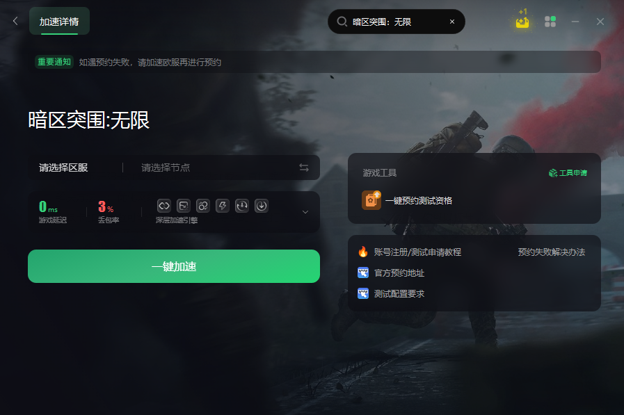 无限卡加载问题可能是由于网络环境导致的。在打开《暗区突围:无限》过程中,你可以打开奇游,搜索”暗区突围:无限”。通过优化电脑本地网络的环境,你可以解决因网络问题导致的加载问题,让游戏顺利加载,让你畅玩游戏。