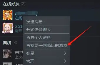 接着啊,找到你想一起玩的好友,右键点一下他的头像,选择“查找要一同畅玩的游戏”。