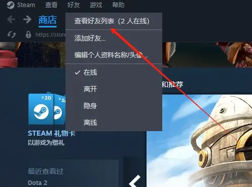 加速完了游戏,咱们再打开steam。在右上角那里点“好友”这一栏,然后查看好友列表。
