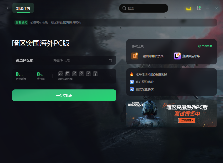 第一步:要是遇到下载失败或者不成功的情况,很可能是网络环境不好。这时候你就可以打开奇游加速器,在上面搜索“暗区突围”,这样能优化网络环境哦!然后点击加速,就可以开始玩游戏啦!