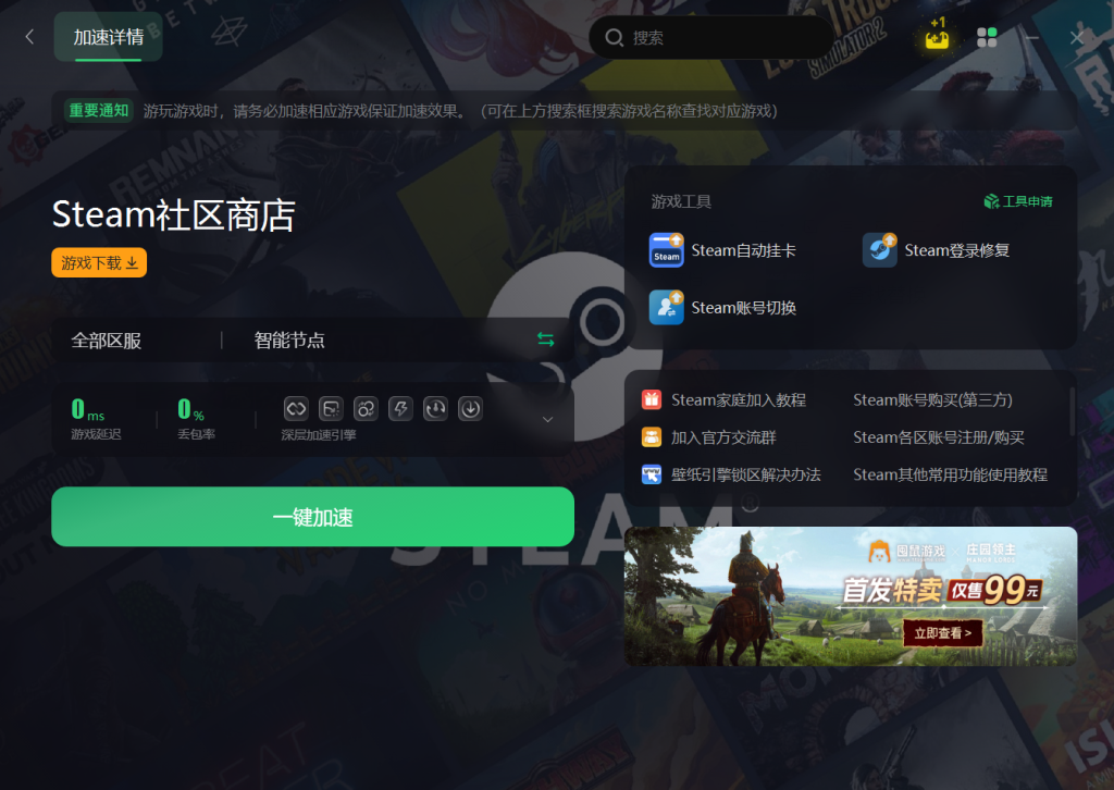 当然,还有更简单的方法,就是用奇游加速工具一键入库下载。安装并打开这个工具后,搜索“APEX英雄”并选择节点进行加速。加速成功后,点那个游戏启动按钮,Steam商店就会自动打开并弹出游戏安装窗口。选个好位置放游戏,跟着提示一步步来,下载完就能玩了。