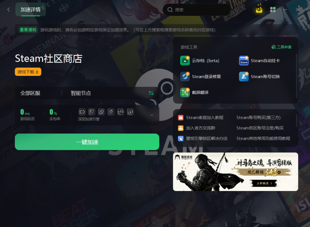首先咱们得说说这网络环境的问题。有时候Steam商店进不去,可能就是网络不太给力。这时候,你可以试试用个加速器,比如奇游加速工具,给电脑网络加把油。在打开Steam商店之前,先打开奇游,然后搜索“Steam商店”给它加速一下。这样一来那些网络问题就统统不见了,你就能顺利进入Steam商店。