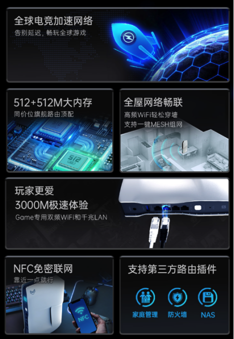奇游联机宝X1 Pro,原创WiFi6加速盒,带你感受更领先的旗舰路由体验。此次联机宝X1 Pro的升级为行业内的加速盒开辟了新的赛道。除了千兆WiFi6与3000速率的满格网速,还搭载了512运存+512内存的旗舰路由及2.5G网口,满足多设备联网下载和顶配的下载速度,轻松跑满极限网速,让路由传输不受瓶颈限制。