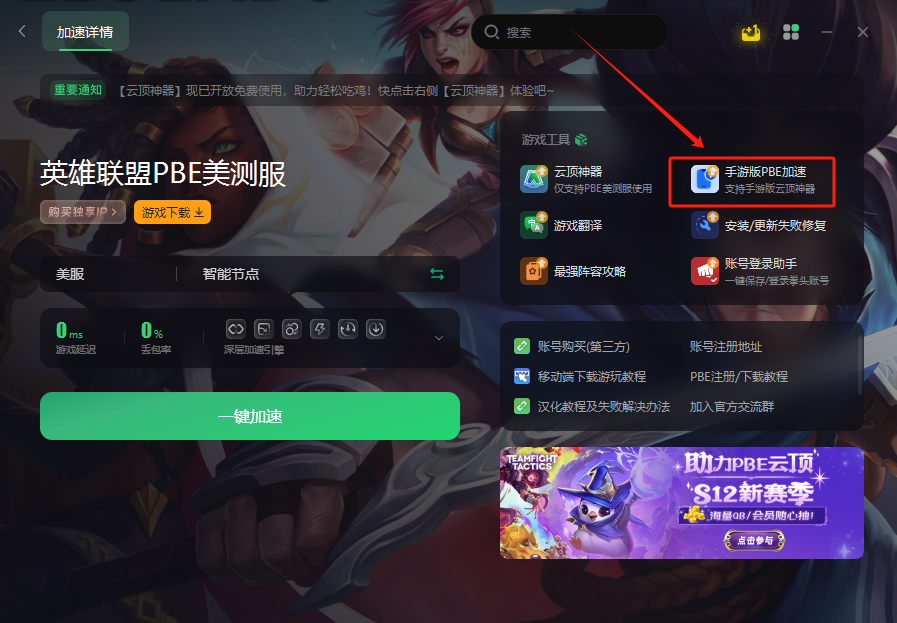 首先,打开奇游加速工具一键搜索“云顶之弈PBE”,通过优化本地网络环境,有效降低延迟与丢包率,从而有效避免因网络问题导致的各种登入障碍。奇游还贴心推出了手机版,让手机党也能轻松享受加速服务,随时随地畅游PBE。