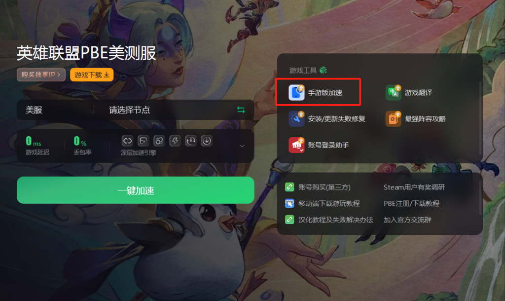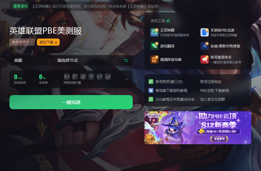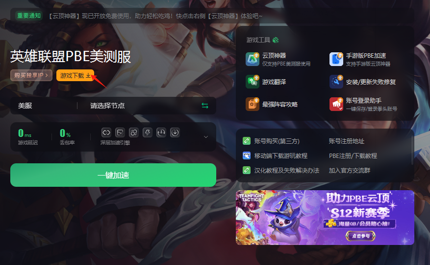 由于PBE是专为美国地区玩家服务的服务器因此在整个下载、安装乃至游戏过程中,持续开启这个加速神器将是你的不二之选。加速完成后只需轻轻一点加速界面的游戏下载,官方正版安装包即刻开始下载比官网直下简单快捷多了。