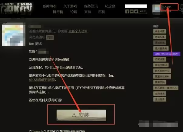 在成功购买并支付后返回官网并登录你的账号。在个人资料页面你将找到游戏启动器的安装选项。点击安装根据提示将启动器下载到你的电脑上。安装完成后,通过启动器即可下载并安装《逃离塔科夫》游戏本体。