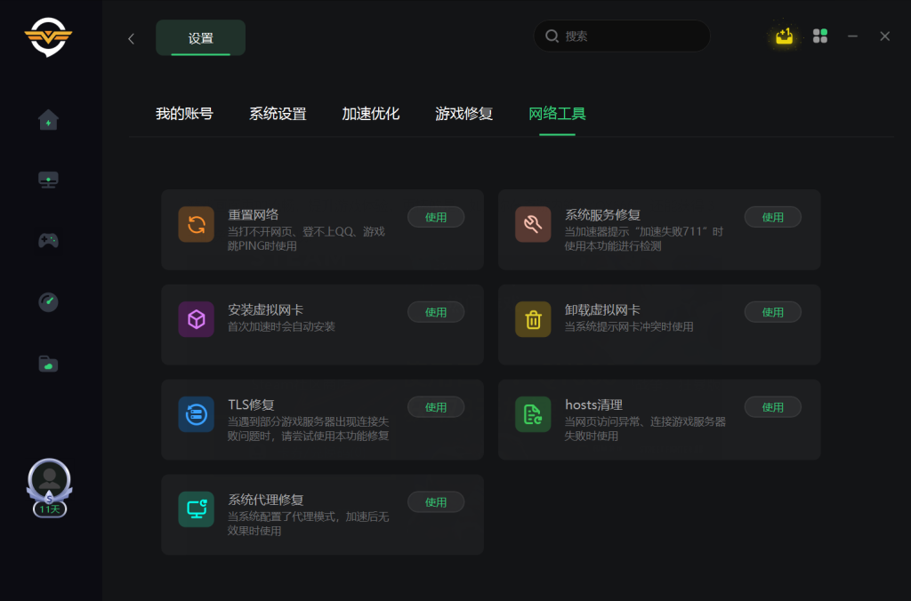 除了加速网络,奇游还内置了专业的网络修复工具和FPS优化工具。要是你碰到网络设置问题、hosts文件异常这些头疼的事儿,直接用它的网络工具箱就能搞定,再也不用为网络问题烦恼了。
