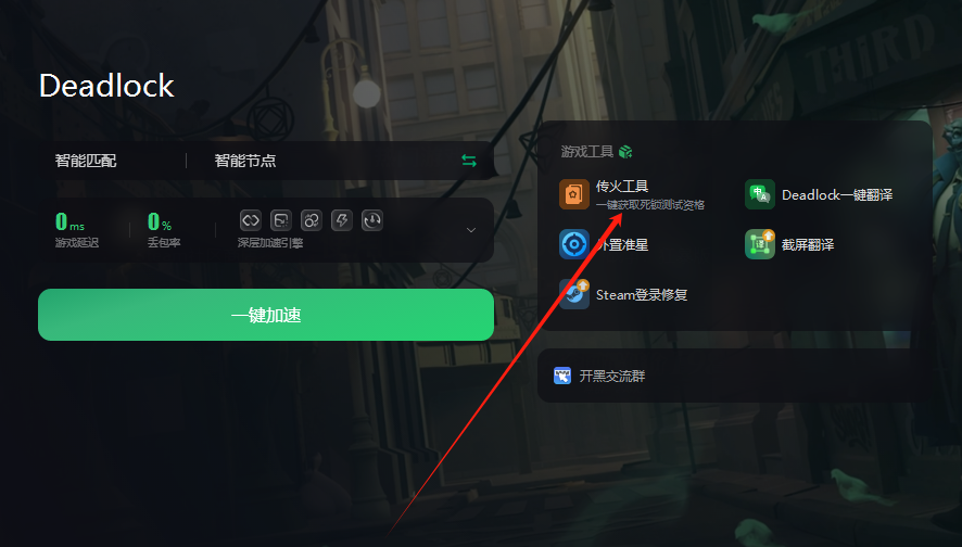 第二步,在【Deadlock】加速页面右侧找到【传火工具】并点击。