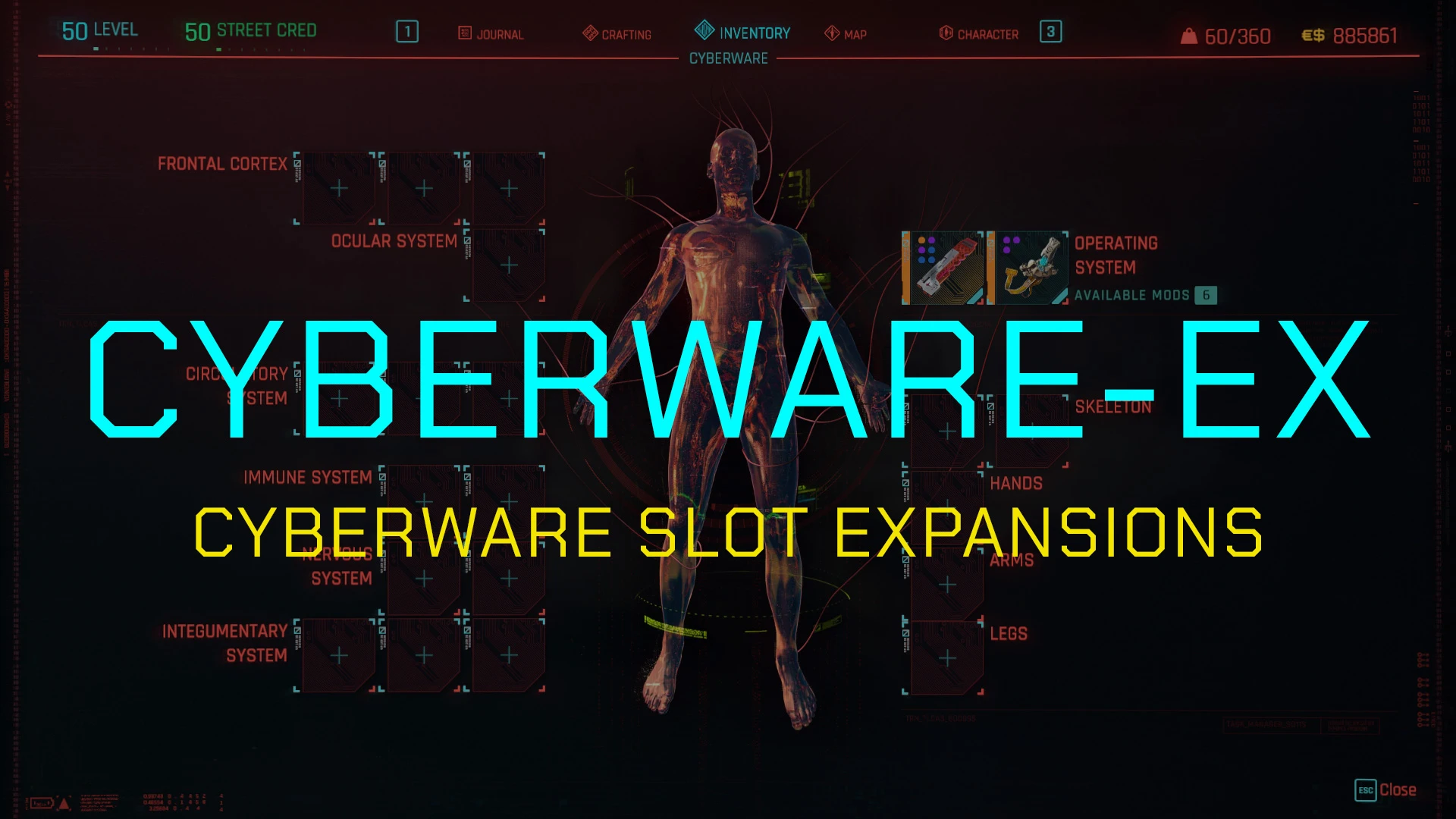 CyberwareEx.UpgradeAllSlotsToMax()解锁所有义体部位的额外插槽。