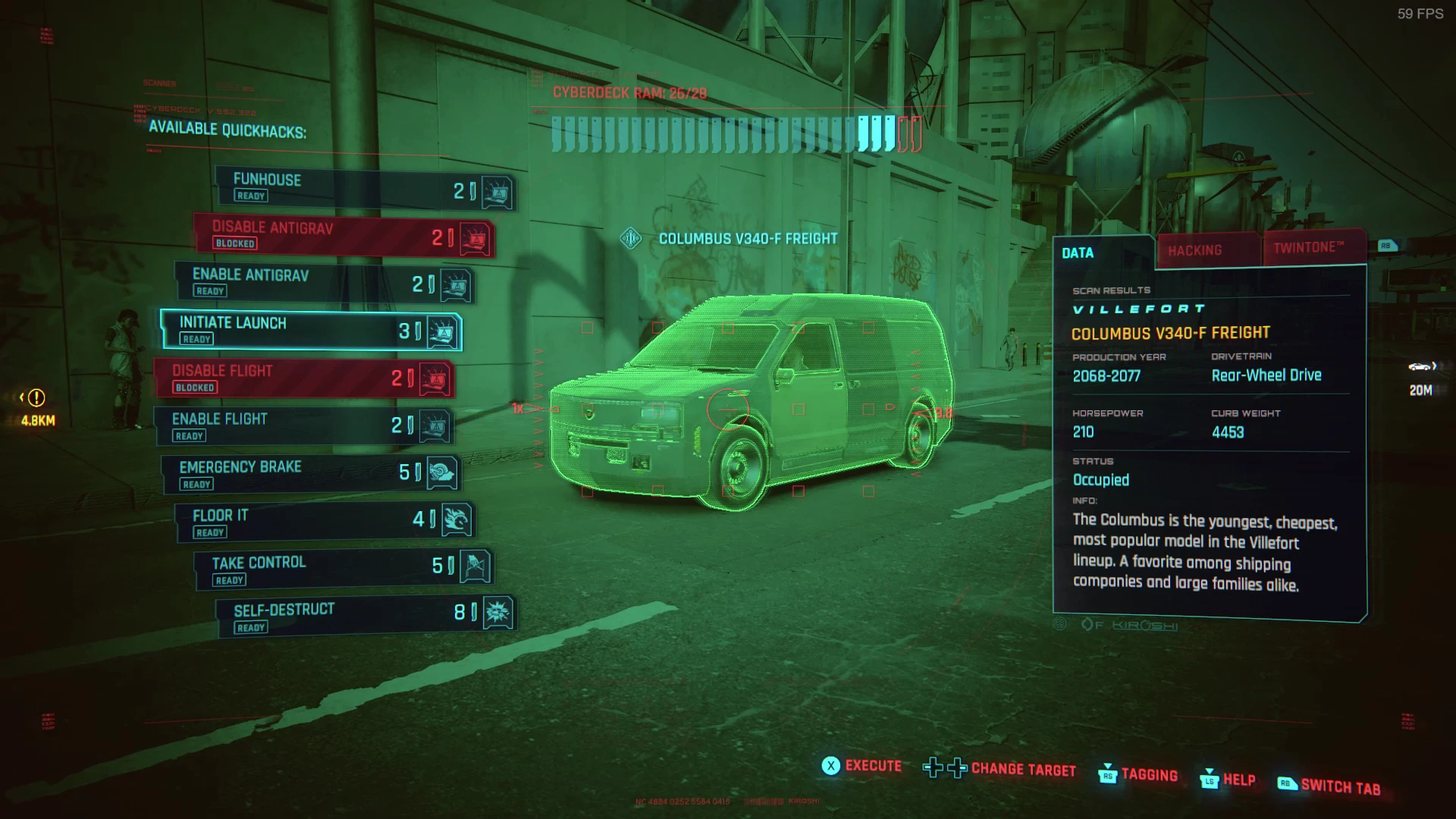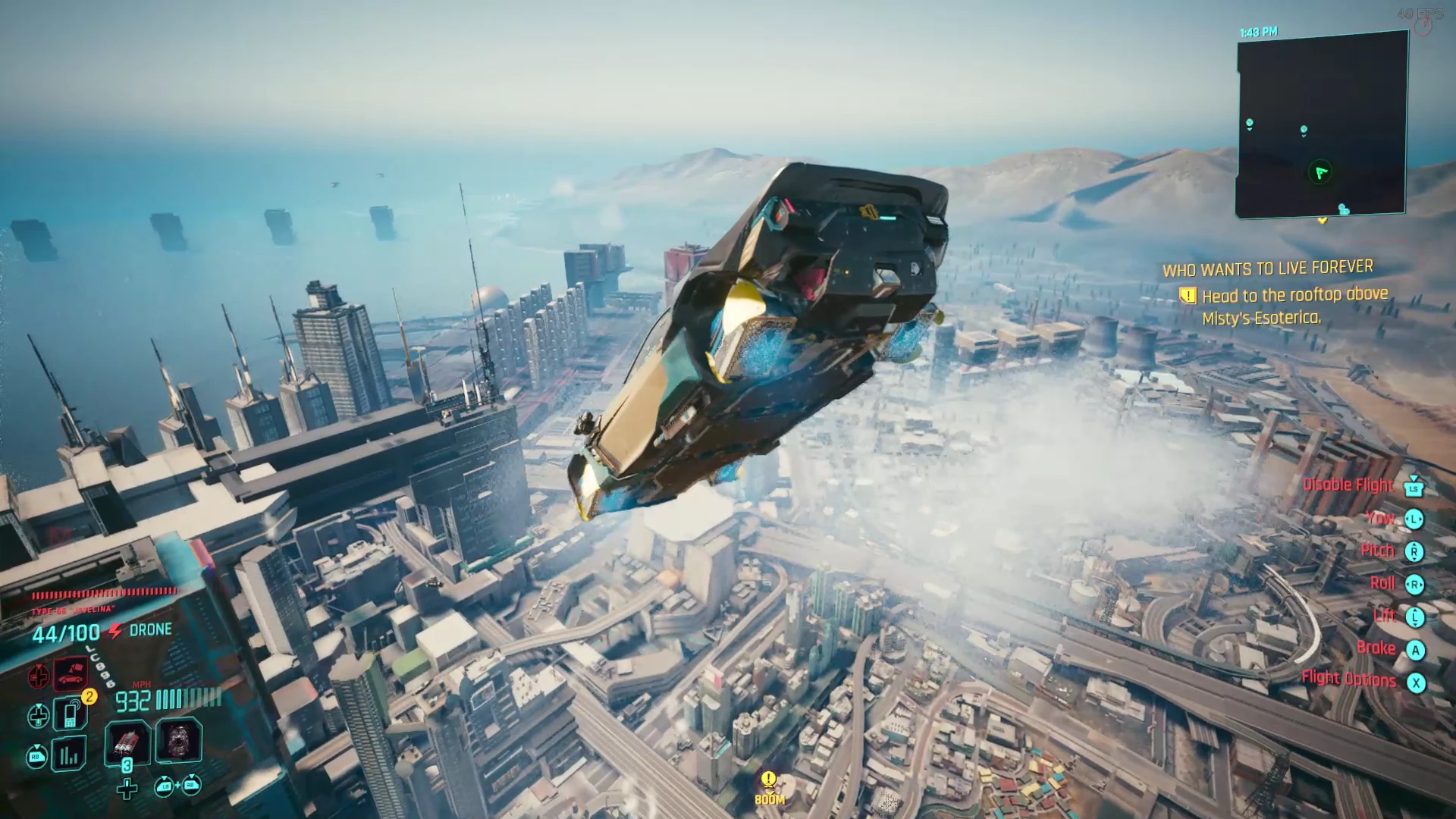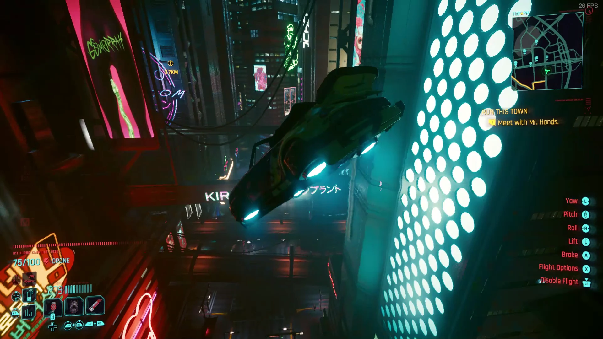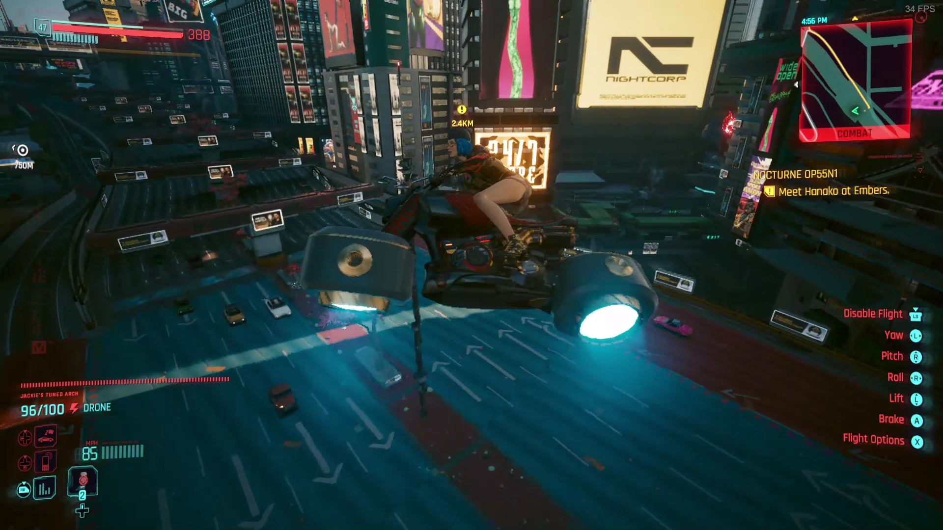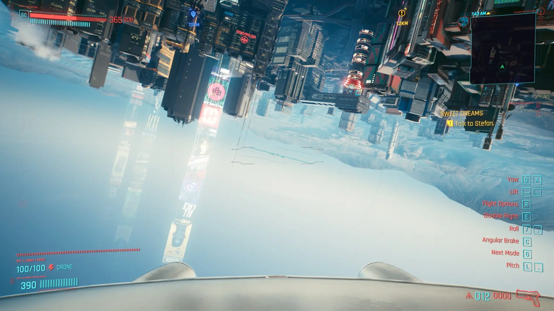 启用输入提示以查看默认按键绑定。可通过编辑 red4ext/plugins/let_there_be_flight/inputs.xml 自定义控制设置——所有可用按键列表请参见:https://nativedb.red4ext.com/EInputKey