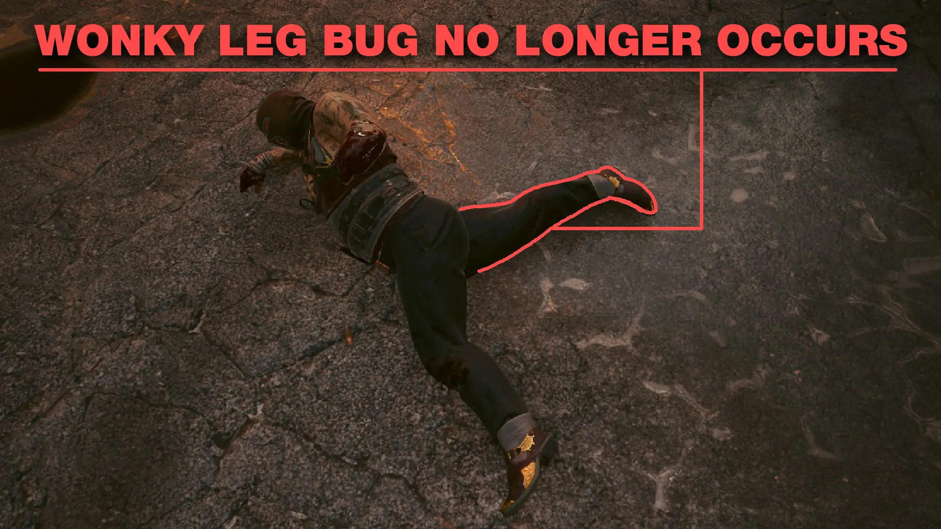 截至 RAGDOLL PHYSICS OVERHAUL 2.0 版本已知问题(所有这些问题都来自《赛博朋克2077》本身,目前尚未解决):- 虽然膝盖弯曲方向错误的情况现在很少发生,但仍然有可能发生。
