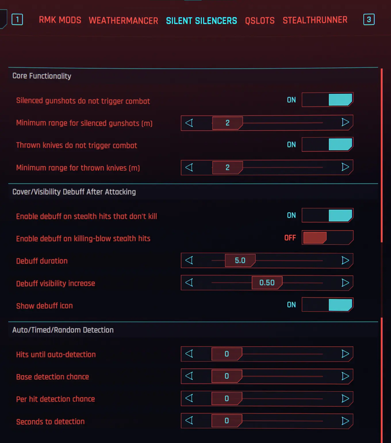 最小距离是指你与敌人保持隐身状态所需的最小距离。降低这些值,即使近在咫尺也能保持隐身(当然,他们仍然可以转身看到你)。提高这些值,则需要远离敌人才能不被发现。