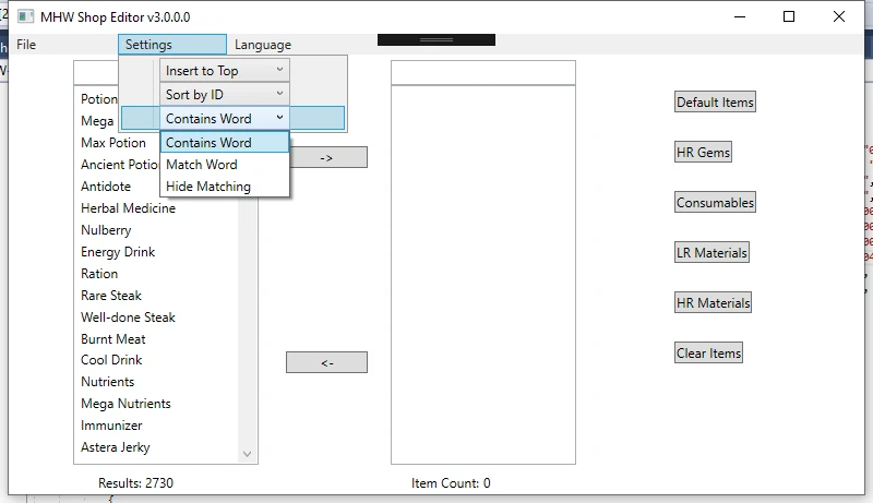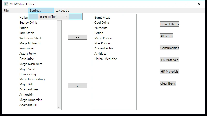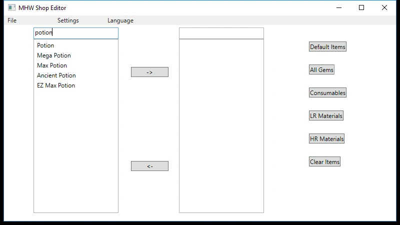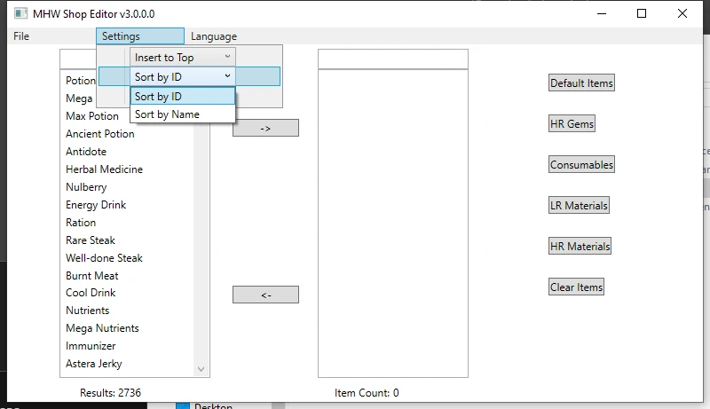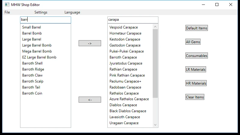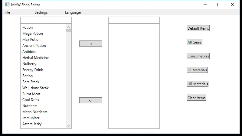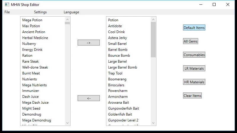 我厌倦了在不同的页面中筛选试图找到我要找的商品,我觉得拥有自己的商店页面会容易得多。所以,我做了一个工具,允许读取/创建不同大小的商店列表文件,最多255个条目。目前包括几个预设,包括低等级材料,高等级材料,宝石和消耗品。