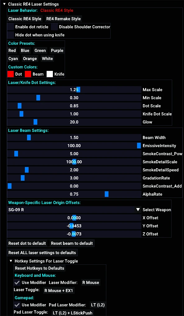 为所有武器重现经典《生化危机4》激光瞄准器,并提供丰富的自定义选项。