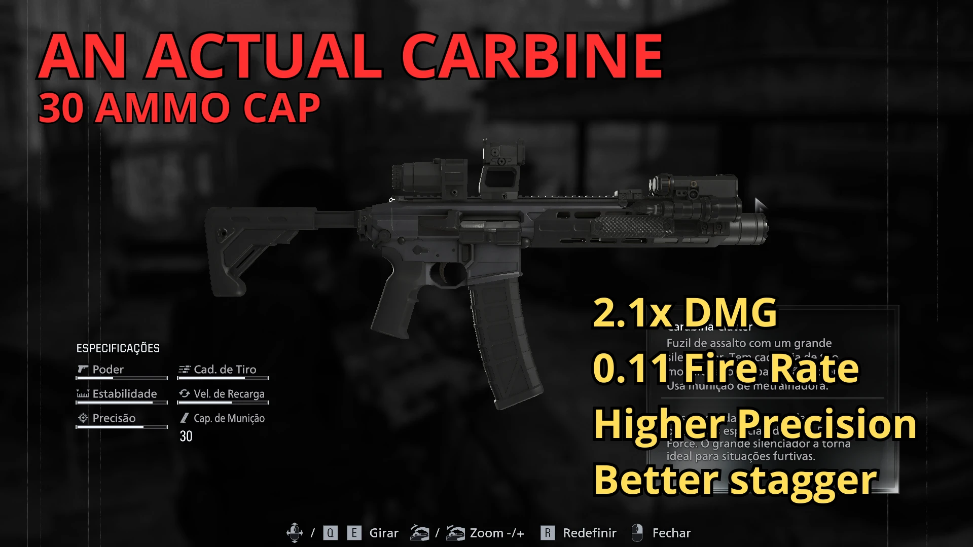 将卡宾枪的连发模式改造为真正的卡宾枪,而非强化版冲锋枪。提升伤害与精准度,调整射速。平衡性上弱于狙击枪,但优于冲锋枪。提供30发弹匣容量版本,以及更平衡的原版增强型。