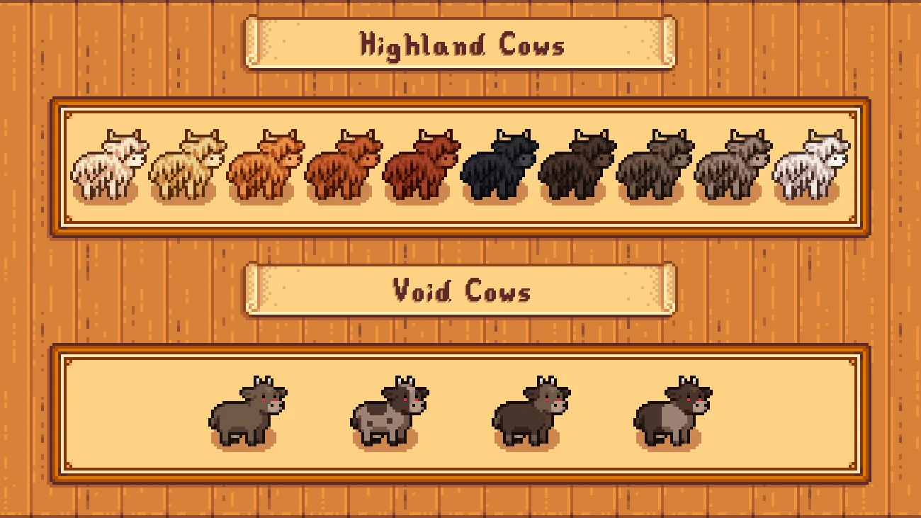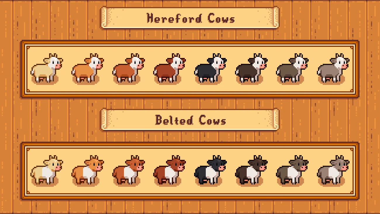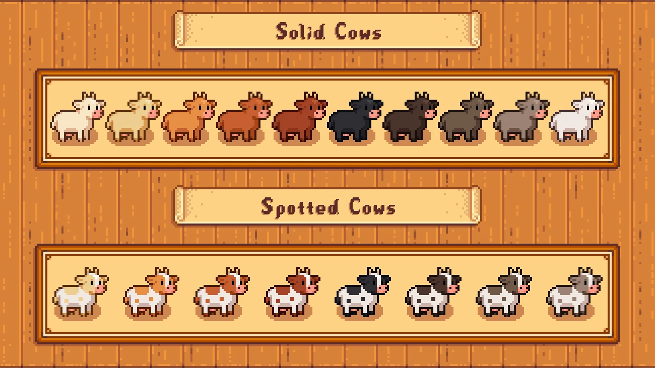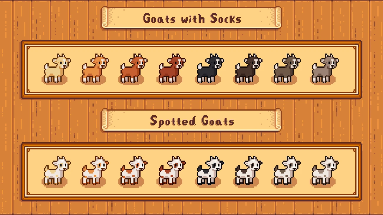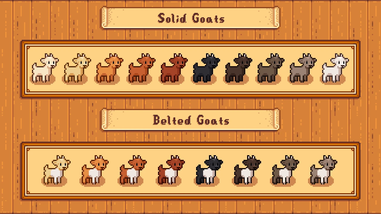 -“皮肤”指的是星露谷1.6中的一个新功能,你可以为你的牲畜拥有多个精灵变体,而不需要使用额外的mod!你可以列出任意多的选项,当一个新的动物被购买、孵化或出生时,游戏会从所有这些选项中随机抽取。你可以使用多个mod来添加新的动物皮肤。在我的mods中,所有皮肤的权重都是一样的(1.0),所以有平等的机会得到你选择的任何一个。