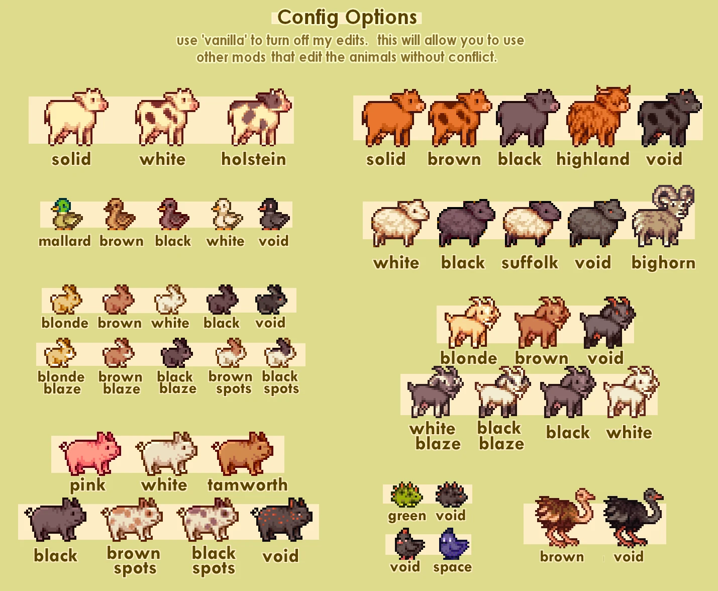 主: 在配置中为每种动物选择你想要的皮肤。所有的猪都将是塔姆沃思,所有的兔子都是金发火焰,等等。