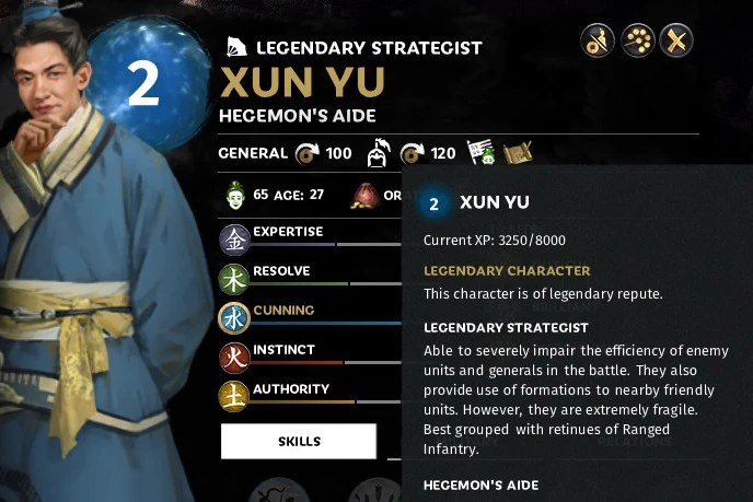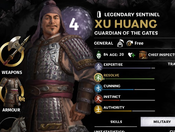 作为魏国五将之一,他一开始没有传奇身份,驻扎在山阳,为汉帝国服务,在最初的10-15个回合内,他很可能会因为汉帝国使用他的侵略性而死亡。他是曹操后期游戏的主要人物之一